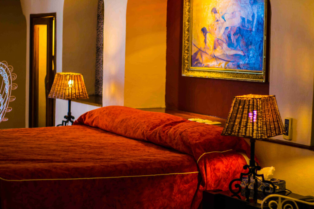 King-size bed or two single beds, air conditioning, ceiling fan, refrigerator, cable TV, telephone, and Roman tubs in the bathrooms, a bottle of purified water (refillable at reception), free Wi-Fi in public areas and rooms, and garden views.