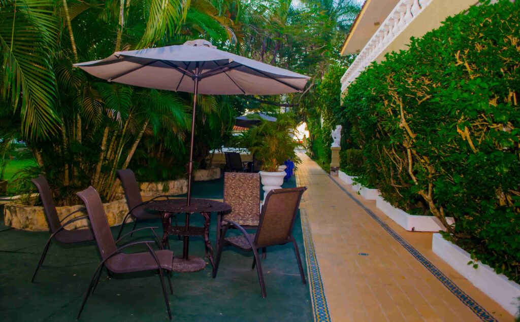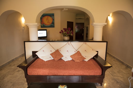 King-size bed and a sofa bed, air conditioning, ceiling fan, refrigerator, cable TV, telephone, safe, marble floors and Roman tubs in the bathrooms, a bottle of purified water (refillable at the reception), free Wi-Fi in public areas and rooms, ocean or garden views, balconies or terraces (on three floors).