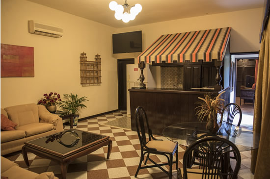 186 m2, including an ocean-view terrace. The Penthouse has 270-degree views of the Caribbean Sea. The Penthouse only has a king-size bed, marble bathroom with tub, living room, bar, and full kitchen, air conditioning, refrigerator, cable TV, telephone, safe, and free Wi-Fi in all public areas and bedrooms.